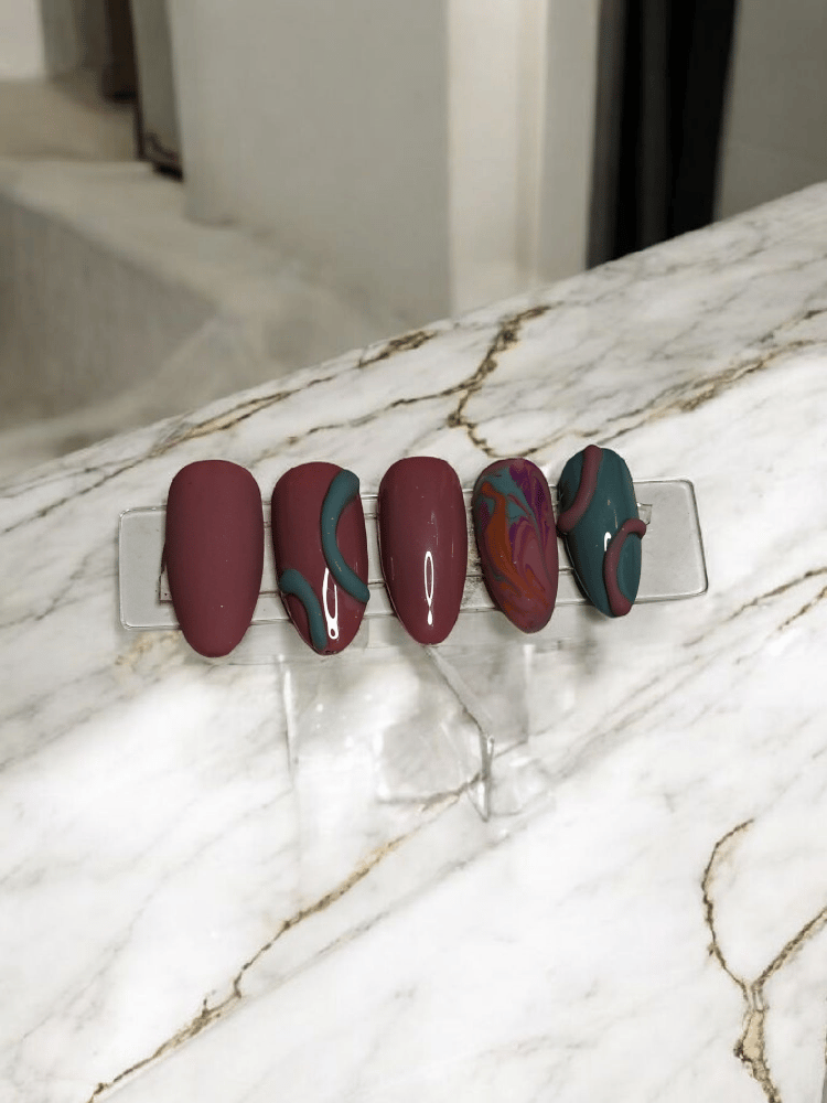 Elevate your everyday look with Mauve Mirage, a stunning blend of modern elegance and artistic edge. This handcrafted press-on nail set features a rich mauve base paired with teal 3D waves and a mesmerizing marble accent that swirls in hints of purple, orange, and rose. Perfect for the woman who loves to stand out with sophistication and creativity.